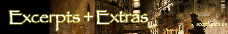 The Lies of Locke Lamora ExcerptHelp yourself to the entire prologue; 9,000+ words, or nearly thirty pages from the book. This sample is from the UK edition of the novel, so British spellings abound. Enjoy!